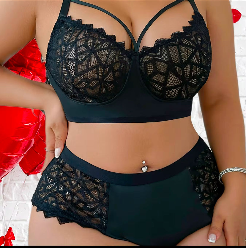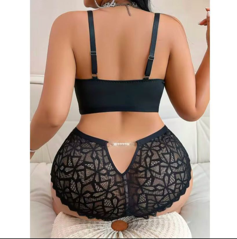 2 piece all black geometric design panty and bra set.
